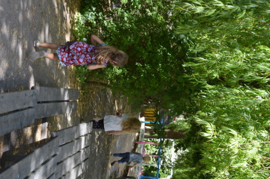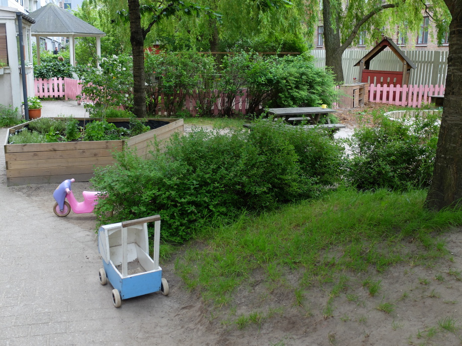 Vores store, skønne legeplads og have appellerer til sanserne med små kroge, blomster og (selvfølgelig) urter. Der er masser af plads til at løbe, cykle, gynge, grave og spise frokost. Vuggestuebørnene har deres egen, overskuelige del af legepladsen. Her er sandkasse, sansegynge, legehus, gå-biler og en lille, hemmelig skovsti.
